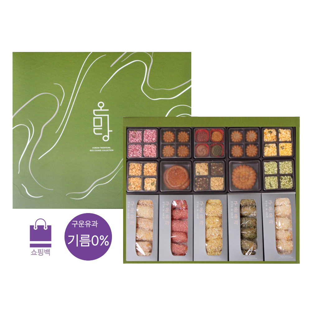 구운유과-(2입*3ea) x 2 복분자딸기유과-(2입*3ea) x 1 단호박유과-(2입*3ea) x 1 인 진쑥유과-(2입*3ea) x 1 다식 -(4ea) x 1 미니약 과-(4ea) x 2 오렌지정 과 -(4ea) x 1
