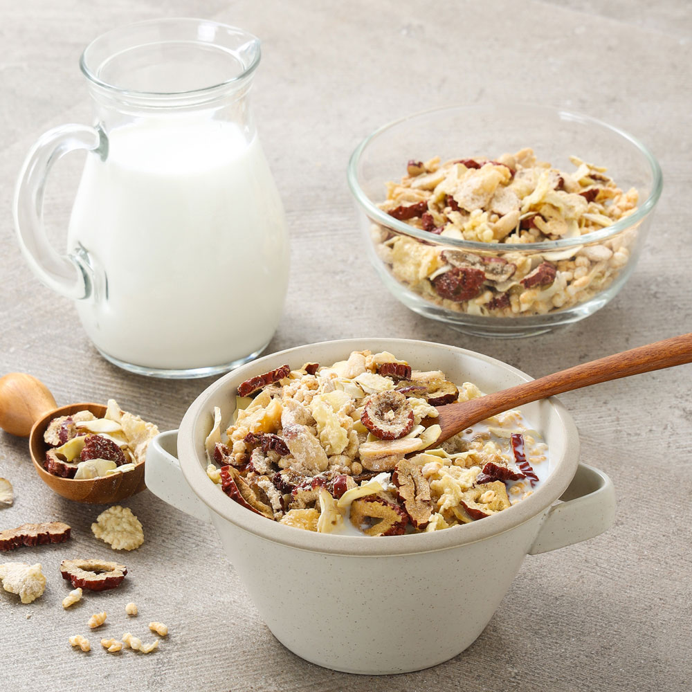 우리쌀프레이크(국산)31.3% 유)볶은현미(국산)18.8% 건조사과(국산)18.8% 무)바삭대추(국산)12.5% 꿀땅콩(국산)12.5% 약콩뻥(국산)6.3%