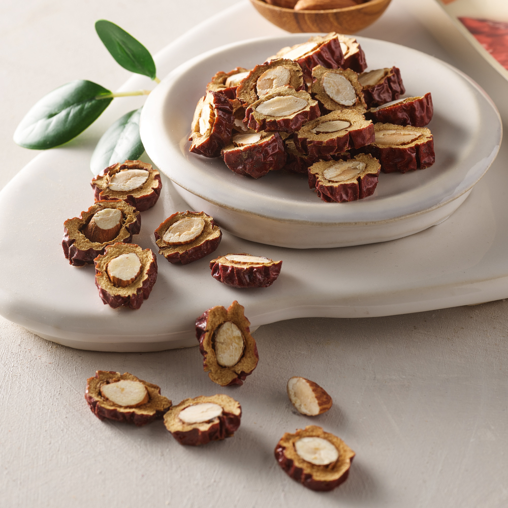 건대추야자76%(튀니지산) 볶은아몬드22%(미국산) 대추농축액{대추100%(국내산)}1%, 볶은콩가루{백태콩100%(국내산)}1%